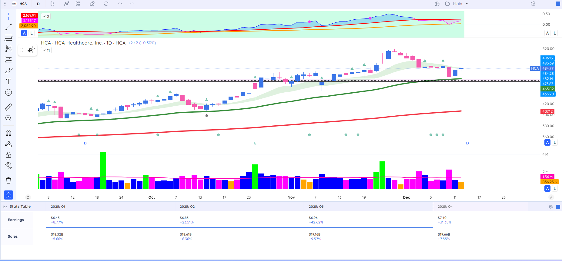 HCA – Strong, defensive healthcare leader bouncing from the 50‑day with excellent fundamentals and a clear support/resistance map; great if you want a calm, institutional‑quality swing.