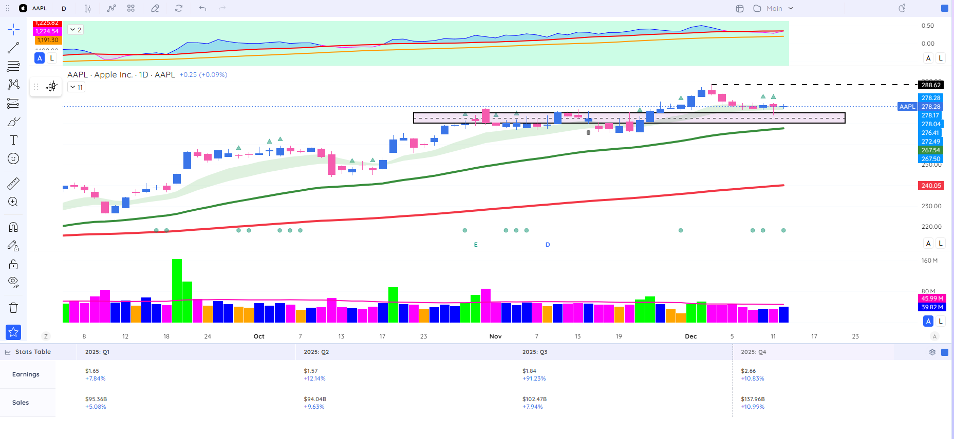 Setup type: Gentle pullback/base under highs with tight daily ranges and low ATR (~1.7–1.8% of price).