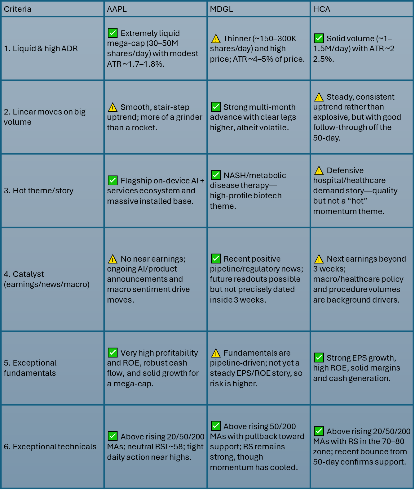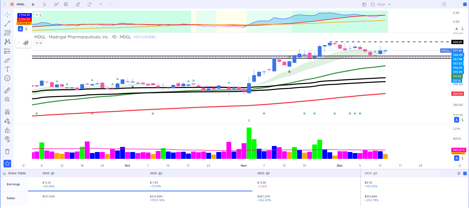MDGL – High‑RS biotech in a constructive pullback after a big run, tied to a hot NASH theme; offers the most upside but also the most volatility and position‑sizing risk.