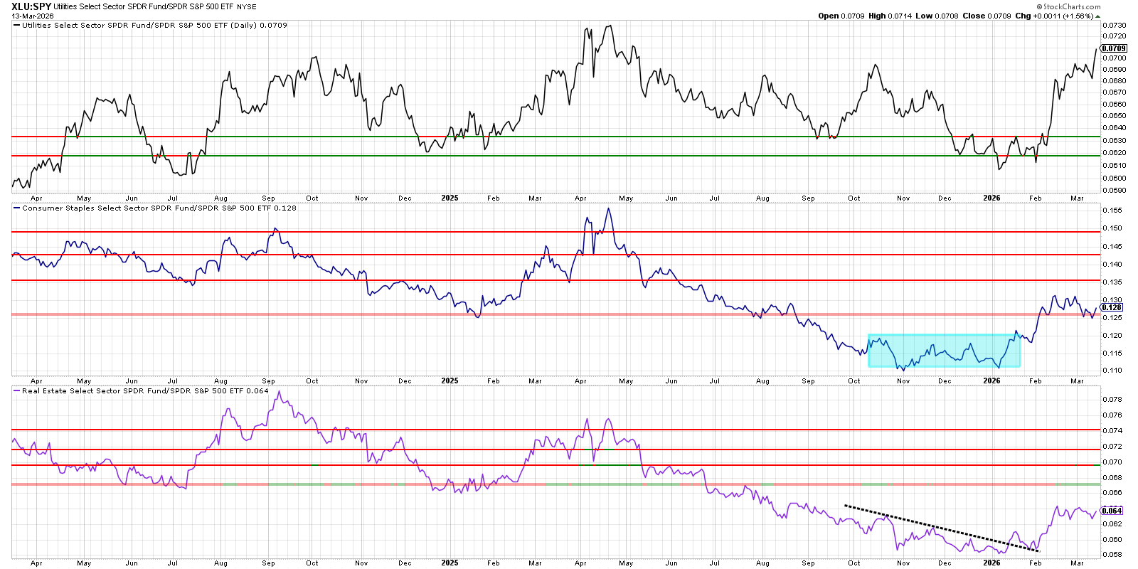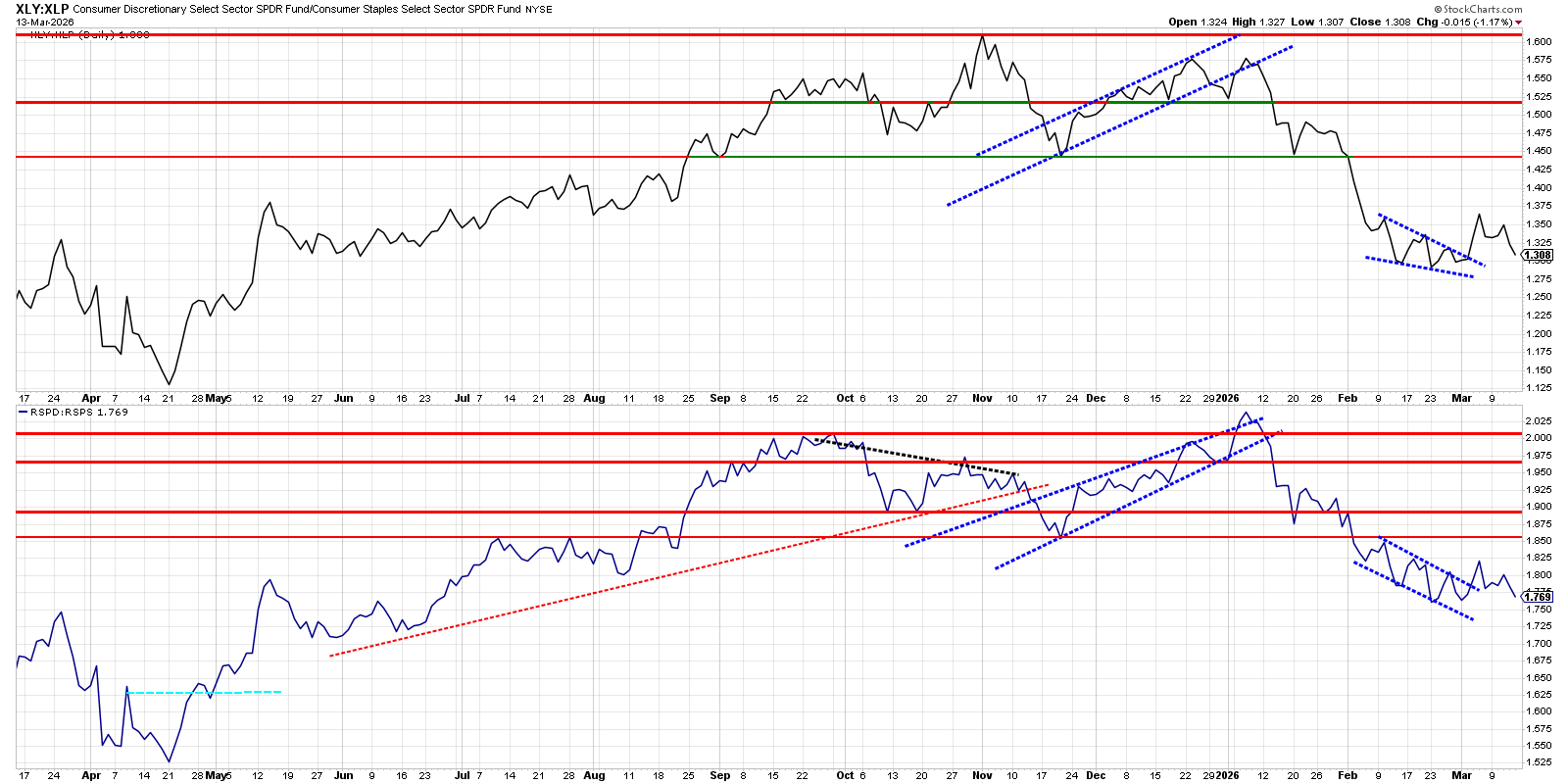 For swing bias, this setup favors defensive or Staples exposure over aggressive Consumer Discretionary as long as both ratios remain below their broken trendlines and flag resistance.