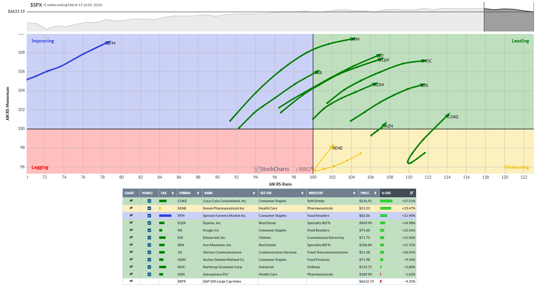 Liquid Leaders Bullish Defensive RRG tickers: COKE, XENE, SFM, EQIX, KR, EIX, IRM, VZ, ADM, NOC, AZN