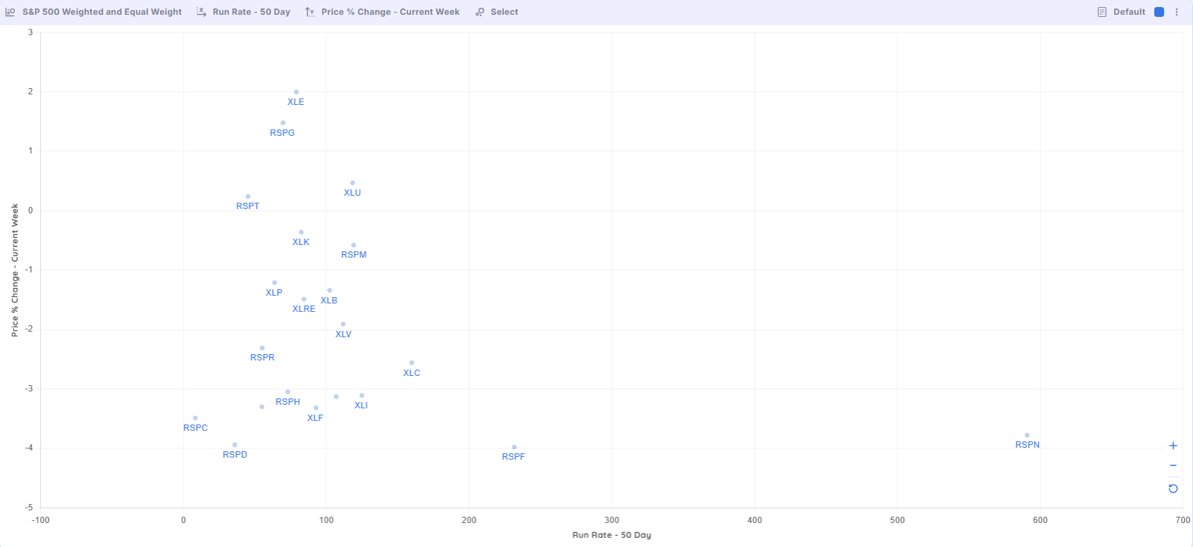 Run rate vs this week’s price change for cap-weighted S&P 500 sector ETFs and equal‑weight sector proxies RSP