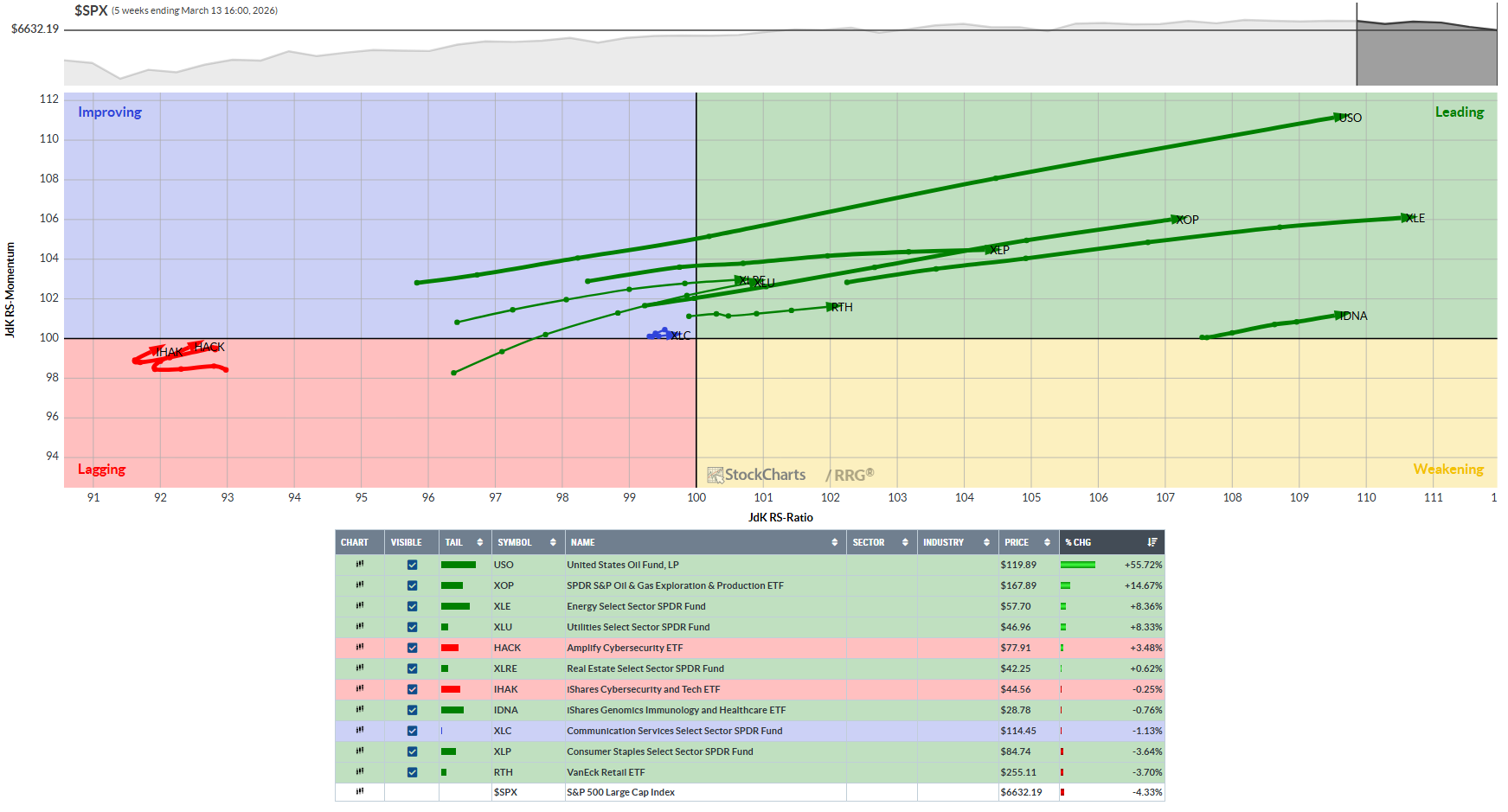 Bullish RRG etfs: XLRE, XLU, XLP, XLE, XLC, RTH, HACK, IHAK, IDNA, USO, XOP