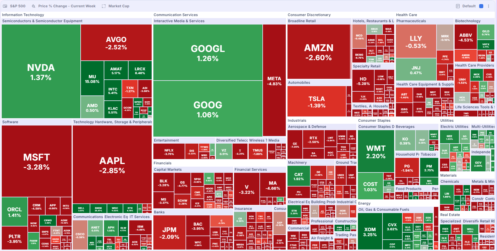 Last week, only 2 of 11 S&P sectors rose: energy (about +2%) and utilities (about +0.5%), while financials were the weakest at roughly -3.3%.