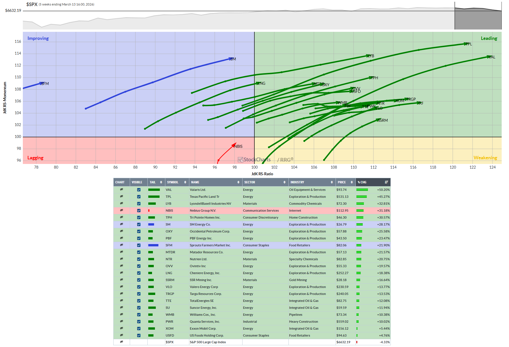 Part 2: Liquid Leaders Value sector with Bullish RRG: VAL, TPL, LYB, NBIS, TPH, SM, OXY, PBF, SFM, MTDR, NTR, OVV, LNG, SSRM, VLO, TRGP, TTE, SU, WMB, XOM, PWR, USFD