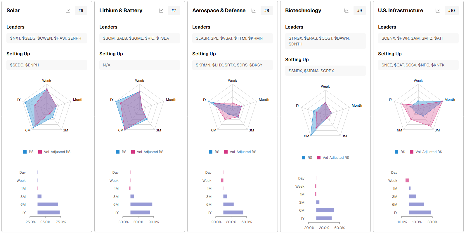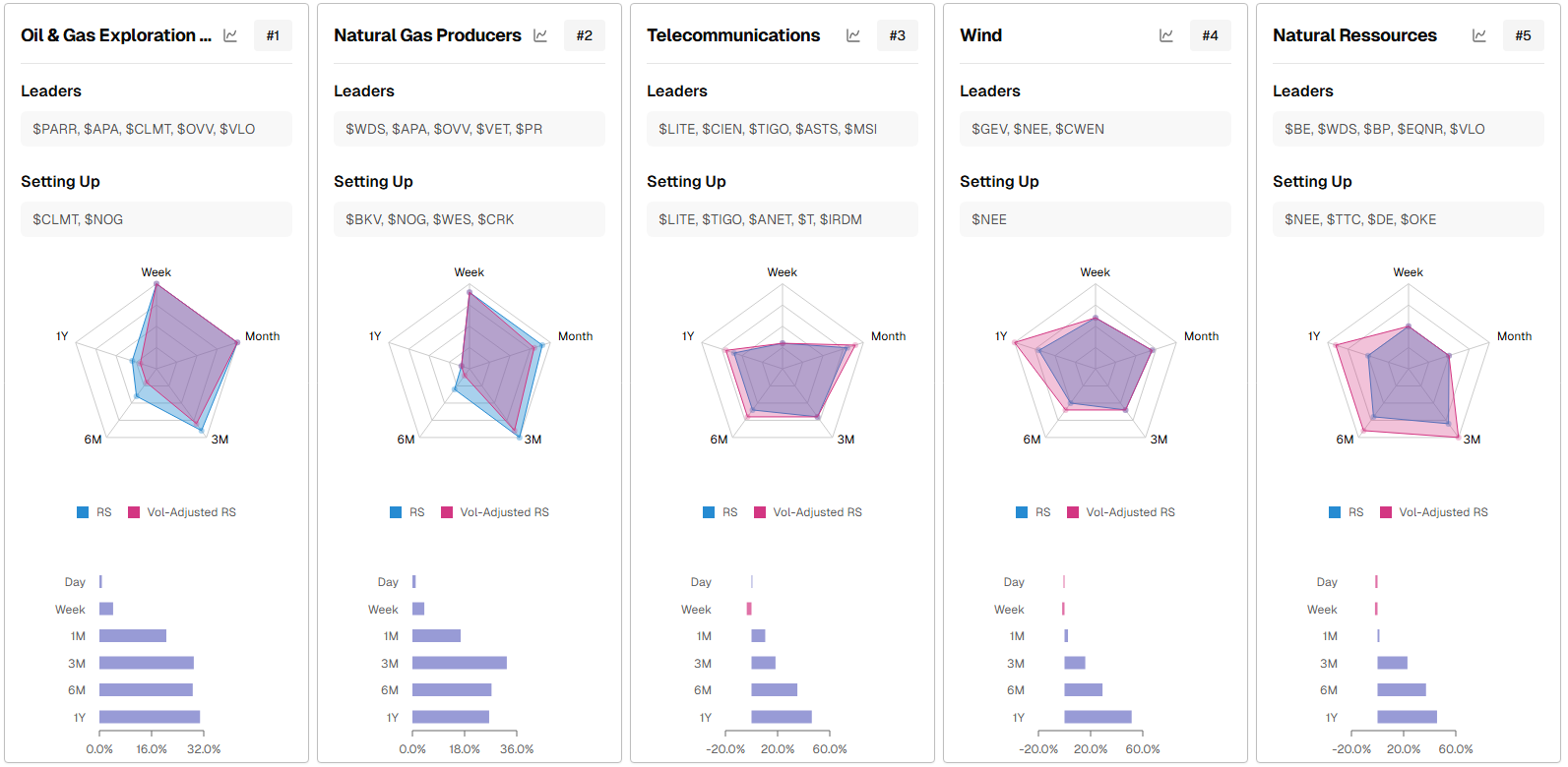 Core trend sleeve: Overweight energy complex plus Natural Resources and Telecom/Infrastructure; focus on liquid leaders from the “Leaders” lists and add from “Setting Up” as they trigger.