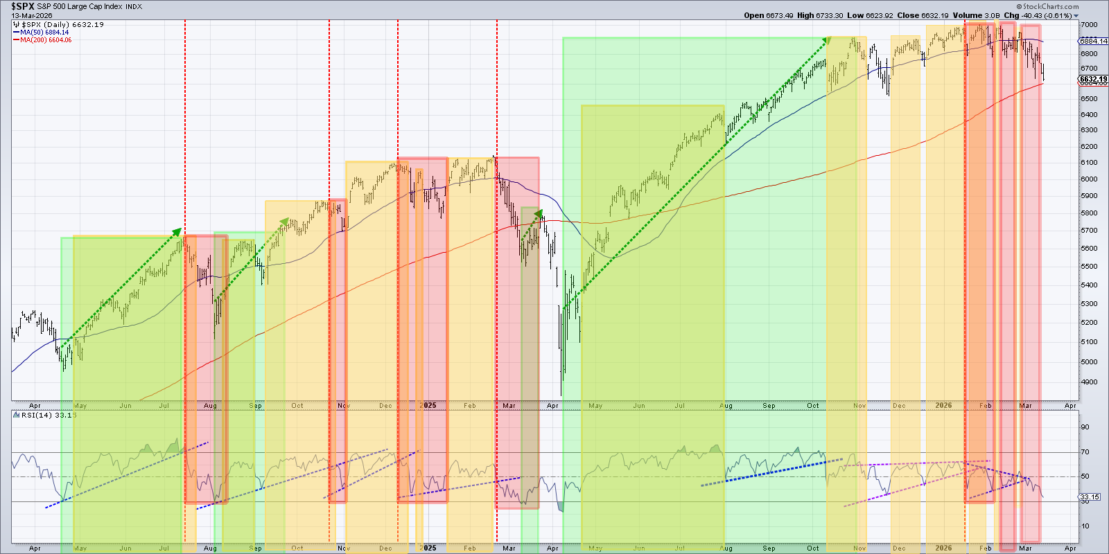 Tape: We’re in a down‑trend within an oversold zone—third red week, YTD lows, VIX in the high‑20s; bounces are possible but not yet trustworthy unless SPX can reclaim prior support levels (e.g., back above 6,780) on strong breadth.