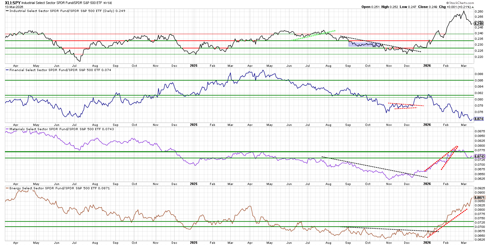 The chart shows a clear rotation within cyclicals: Energy is emerging as the clear RS leader, Materials broke its year‑long downtrend and is attempting to turn up off a key level after pulling back from the new higher high, while Industrials and Financials remain stuck in weakening/neutral ranges vs SPY.