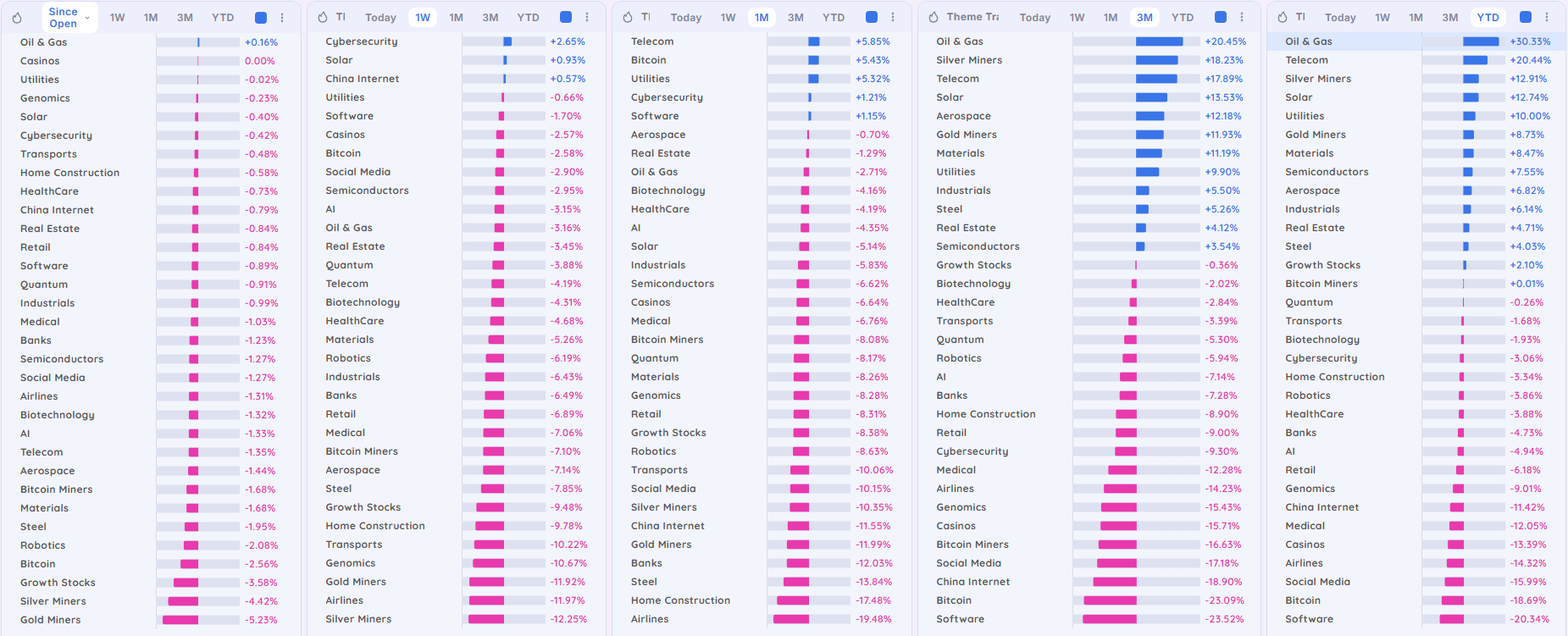 The dashboards show strong, persistent relative strength in Oil & Gas, with Telecom and precious metals (Silver/Gold Miners) emerging on the 3‑month and YTD views, while classic growth/tech themes like Software, Bitcoin, and Social Media are weak across most timeframes.
