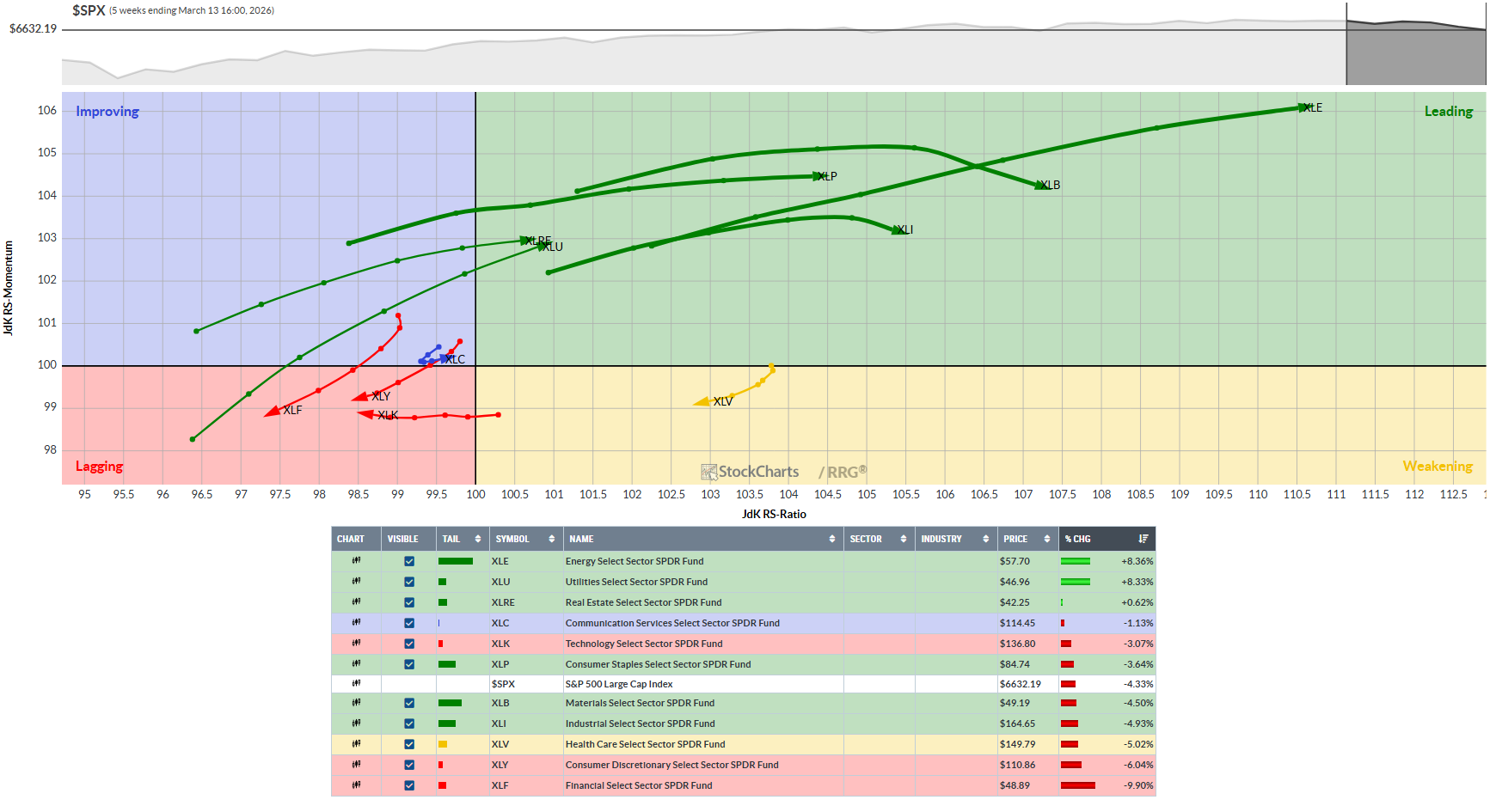 This chart provides a relative strength and momentum snapshot for all S&P sector ETFs against the SPY over the 5-week period.