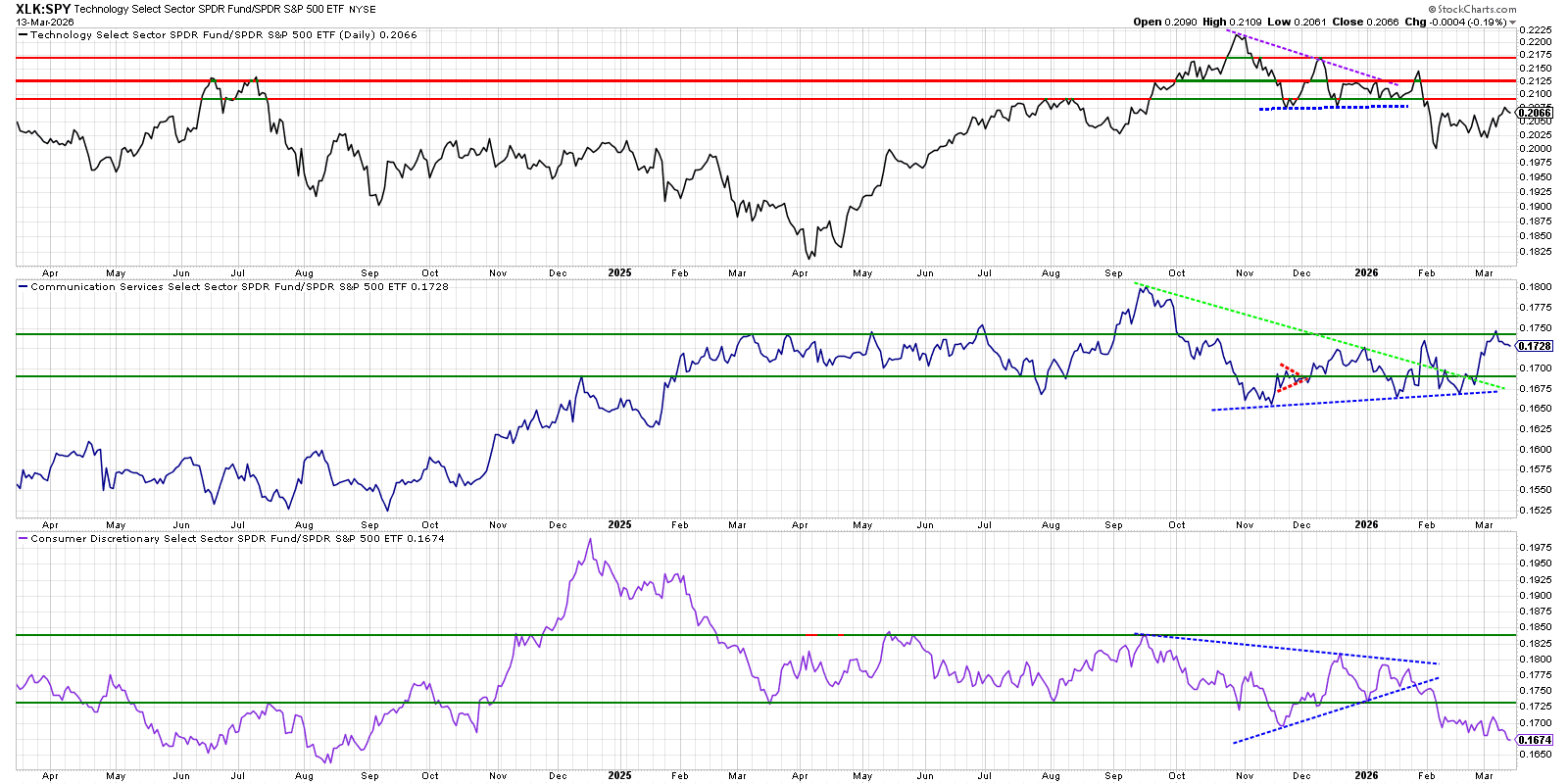 Communication Services is the only one of the three showing improving RS characteristics right now (higher low, trendline break, testing resistance), so for swing entries within “growth” sectors, XLC looks like the cleaner RS bet until its new up‑trend fails.