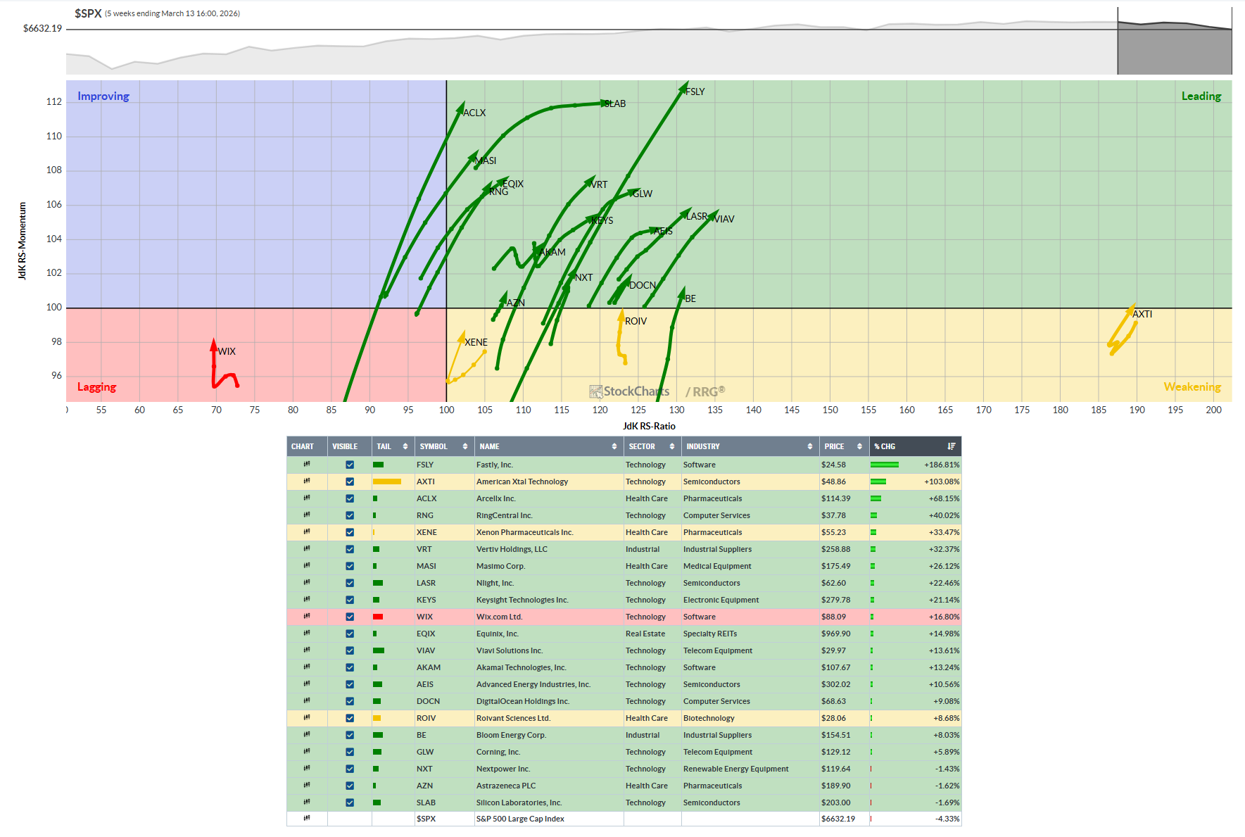 Liquid Leaders Growth sector with Bullish RRG: AXTI, ACLX, RNG, XENE, VRT, MASI, LASR, KEYS, WIX, EQIX, VIAV, AKAM, AEIS, DOCN, ROVR, BE, GLW, NXT, AZN, SLAB