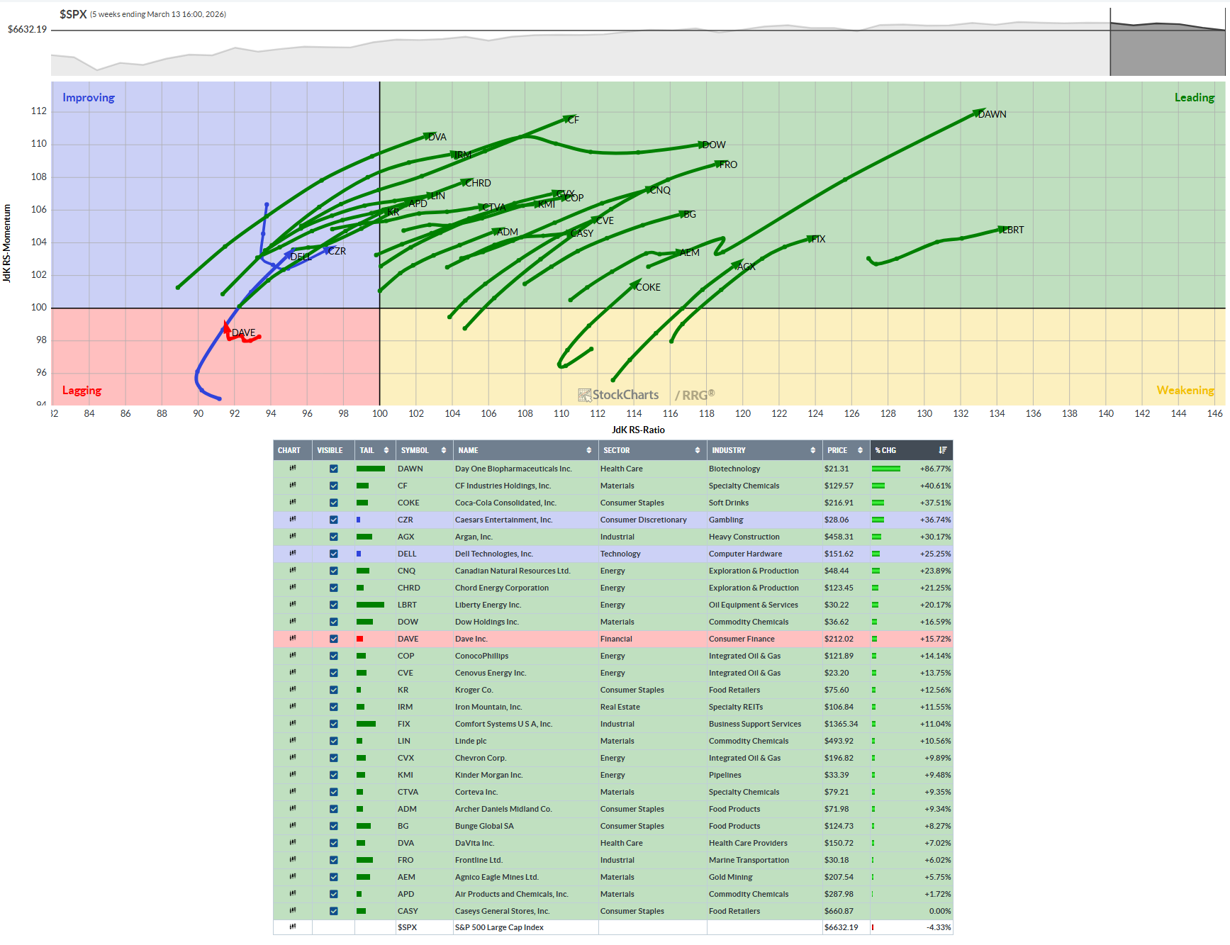 Part 1: Liquid Leaders Value sector with Bullish RRG: DAWN, CF, COKE, CZR, AGX, DELL, CNQ, CHRD, LBRT, DOW, DAVE, COP, CVE, KR, IRM, FIX, LIN, CVX, KMI, CTVA, ADM, DVA, FRO, AEM, APD, CASY, SSPX