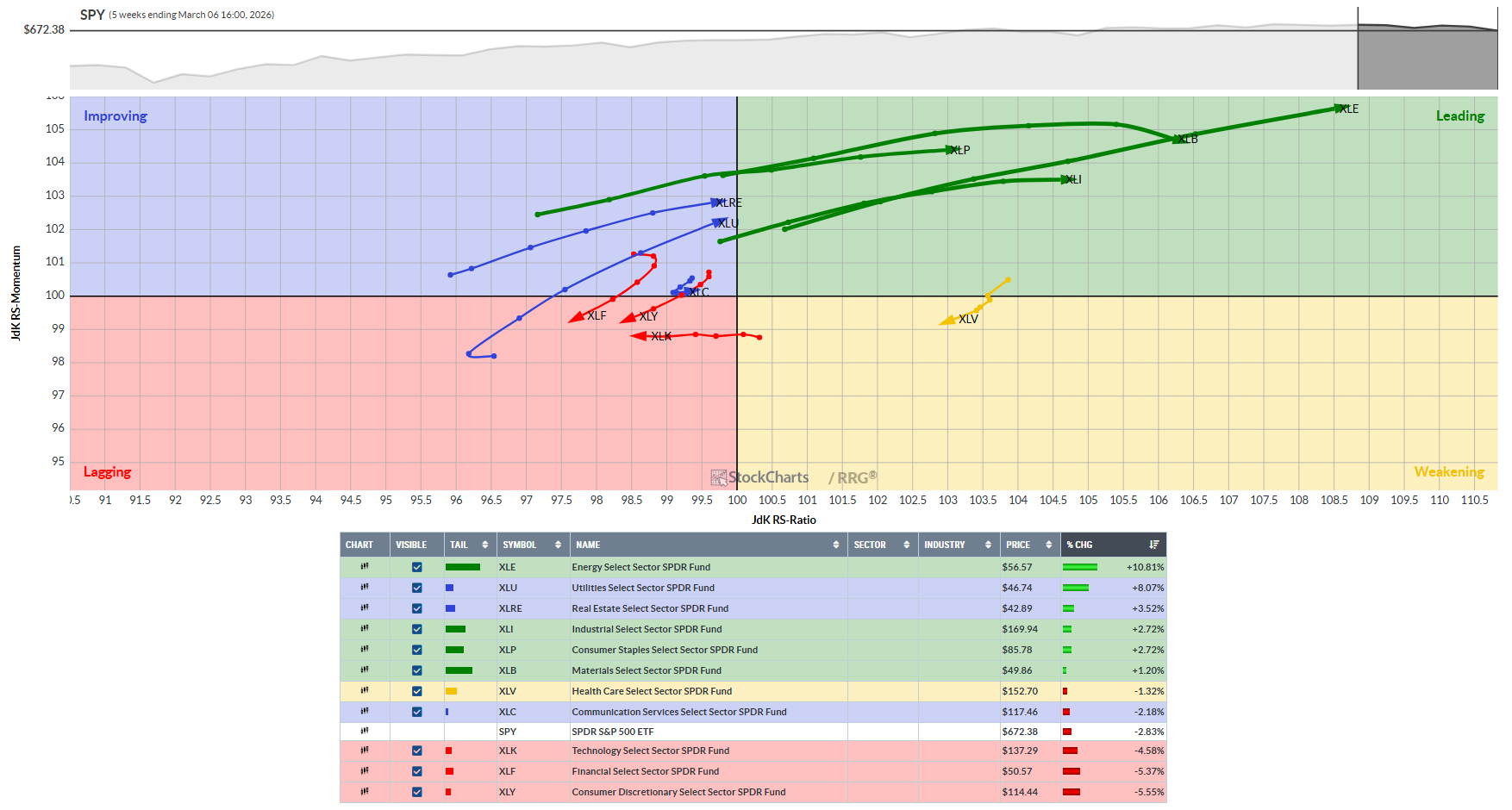 This chart provides a relative strength and momentum snapshot for all S&P sector ETFs against the SPY over the 5-week period.