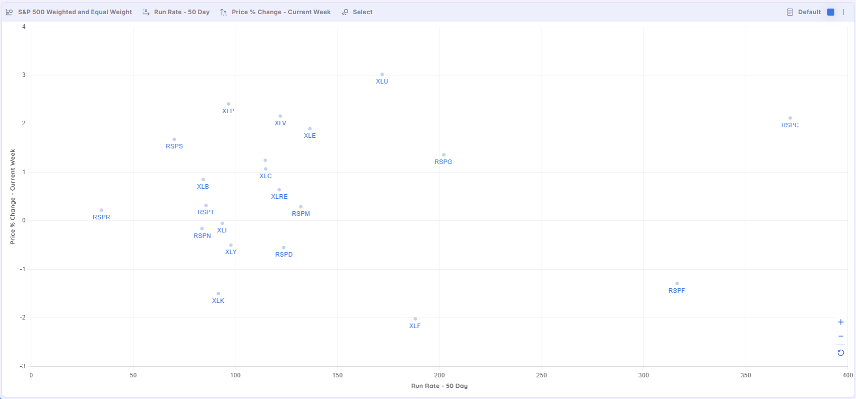 Run rate vs this week’s price change for cap-weighted S&P 500 sector ETFs and equal‑weight sector proxies RSP
