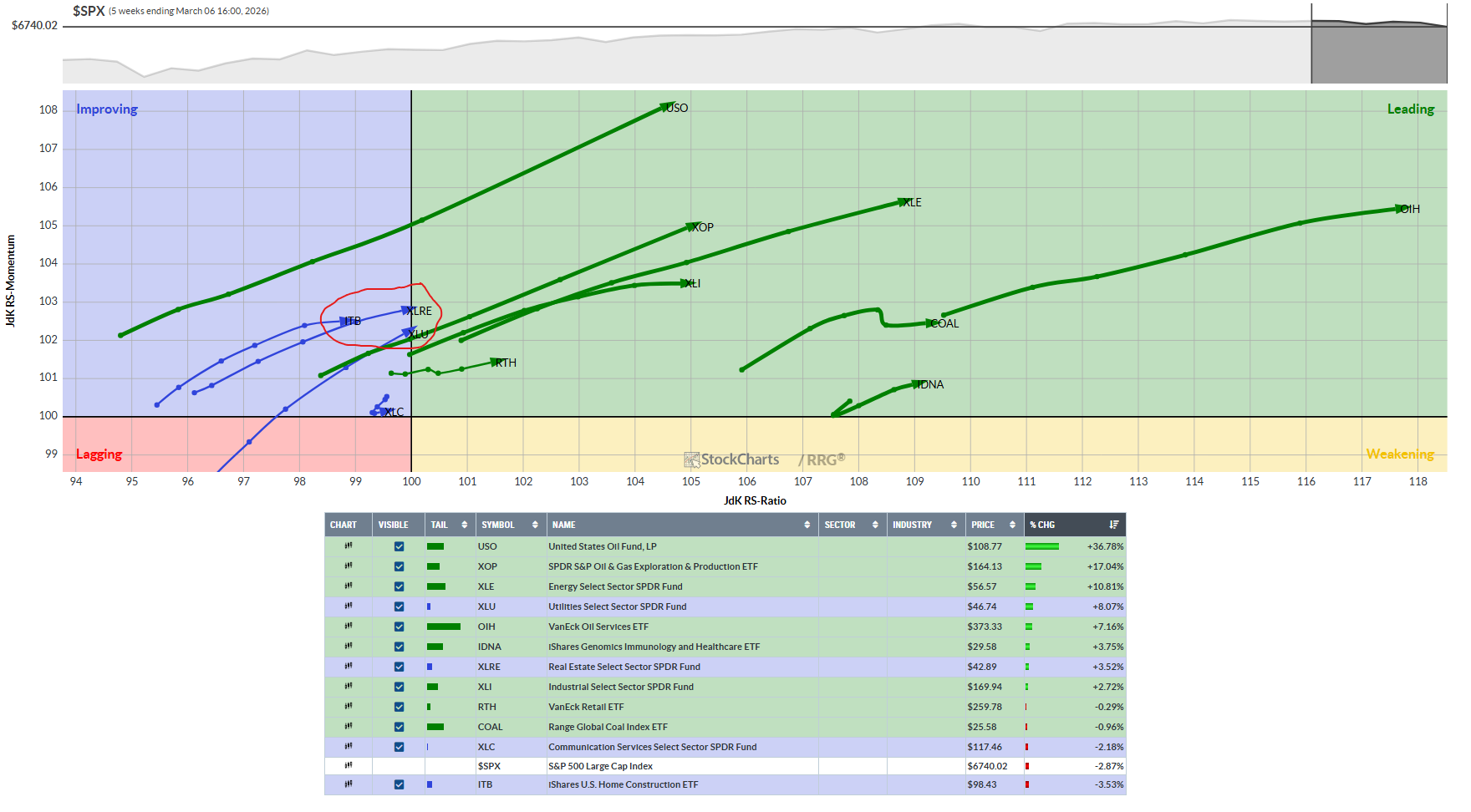 Bullish RRG etfs: USO, XOP, XLE, XLU, OIH, IDNA, XLRE, XLI, RTH, COAL, XLC, ITB