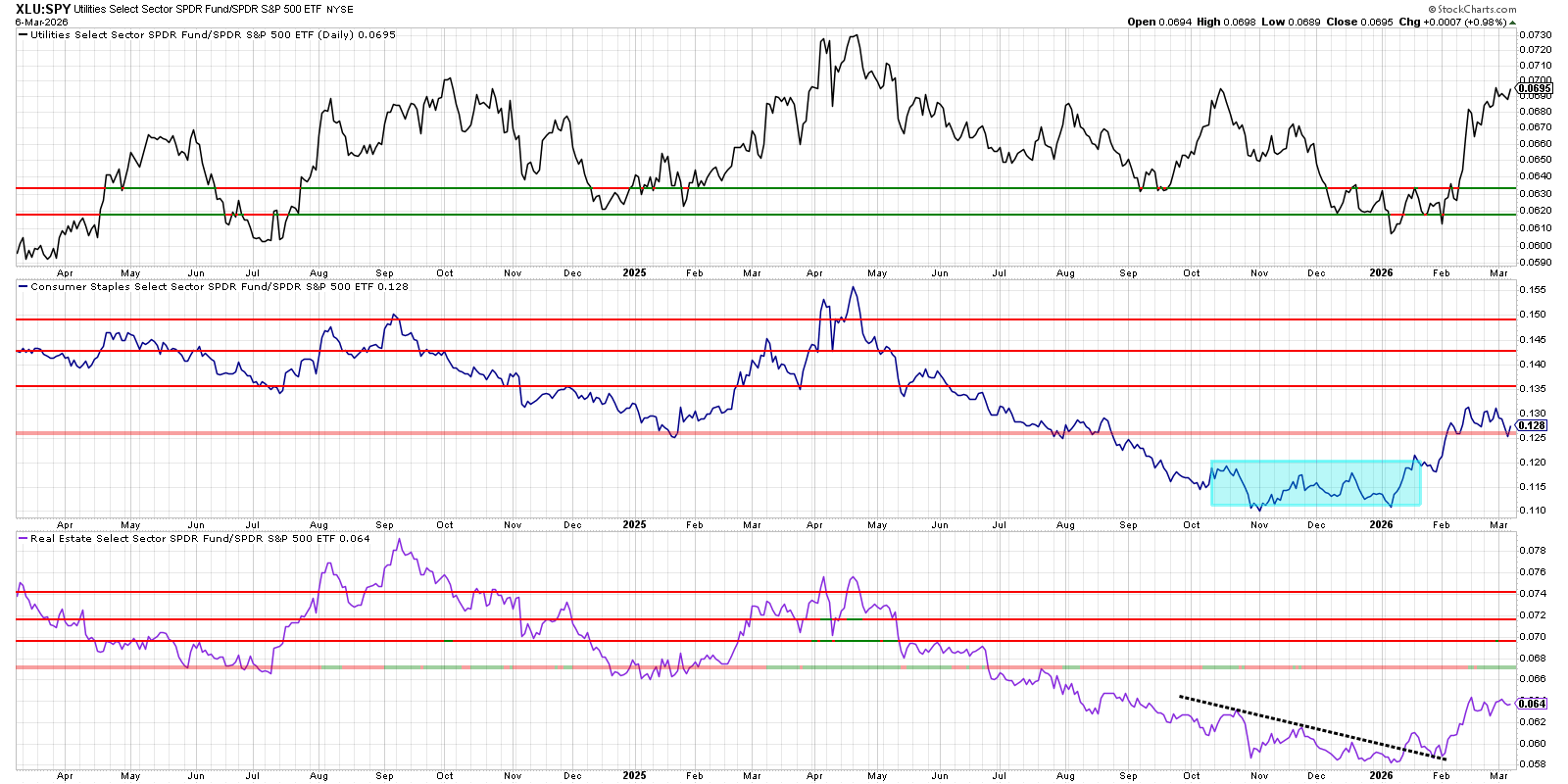 Taken together, the chart shows “defensive rotation,” but it is strongest in utilities, improving in staples, and not yet confirmed in real estate.