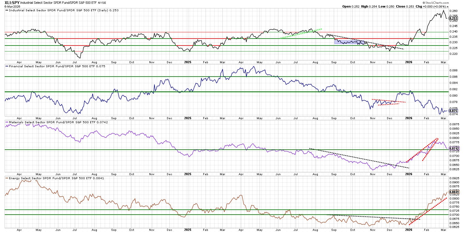 XLI has been and XLE is clearly emerging as relative-strength leaders vs SPY, while XLF lags and XLB is trying to turn up but is less convincing so far.