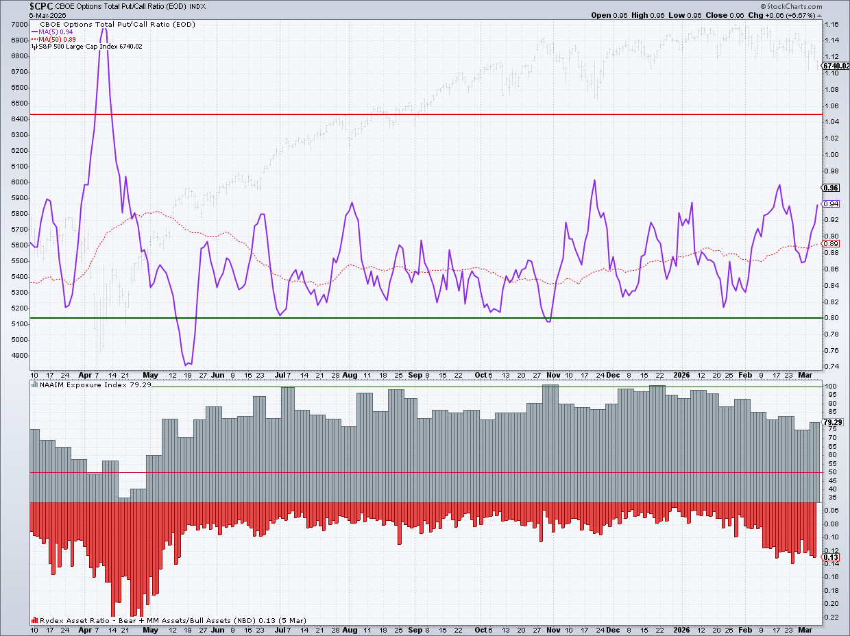 Last week we noted the wedge and said, “Getting tight… Big move coming…”. Well, it did… And now we are positioned all cash and waiting for signs of a bottom. We want to see the CPC total Put/Call ratio (below) exceed 1.04 or start to fade somewhere up there and then we really want to aggressively hit those follow through days that often follow. We still won’t know if it will work, but the stock gods favor that attempt when it occurs.