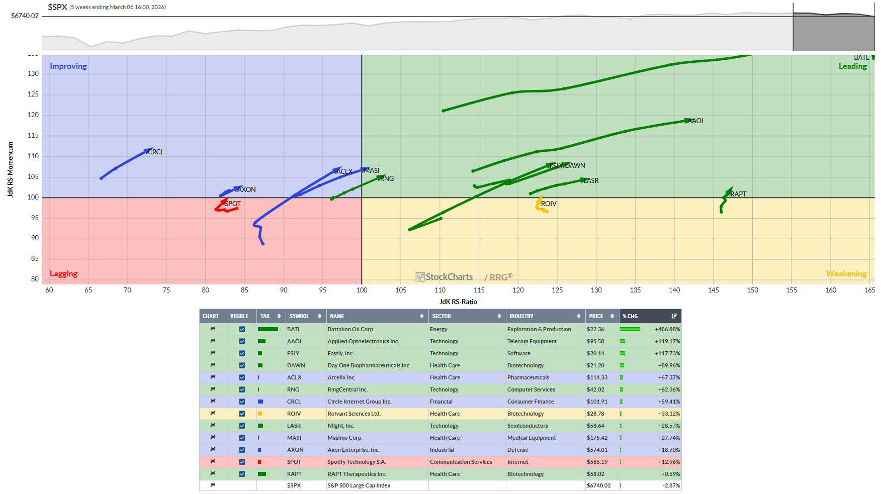 Liquid Leaders Growth with Bullish RRG: BATL, AAOI, FSLY, DAWN, ACLX, RNG, CRCL, ROIV, LASR, MASI, AXON, SPOT, RAPT