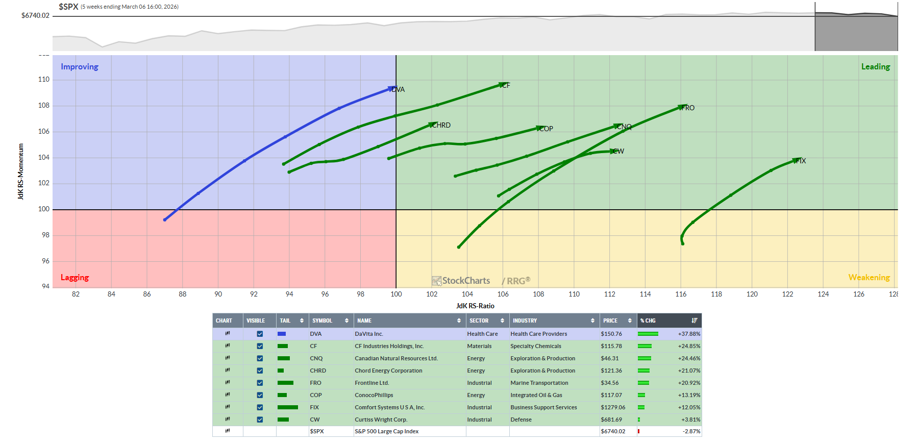 Liquid Leaders Bullish Value RRG tickers: DVA, CF, CNQ, CHRD, FRO, COP, FIX, CW