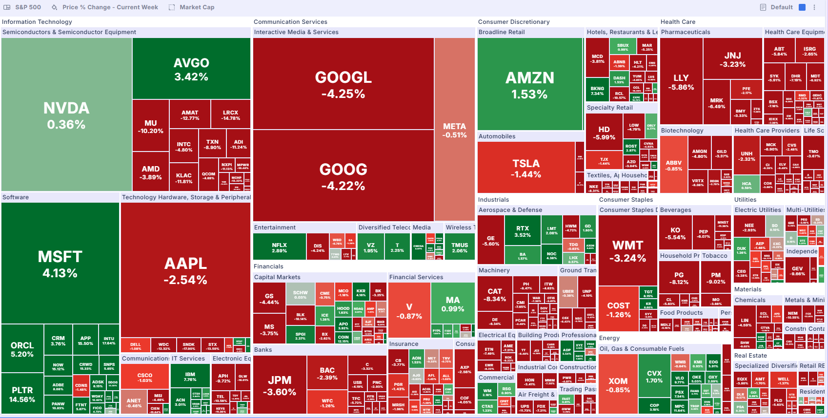 Index leadership is extremely concentrated in a handful of mega-cap tech (MSFT, NVDA, AMZN, a bit of ORCL/PLTR) while the rest of the market is broadly sold.