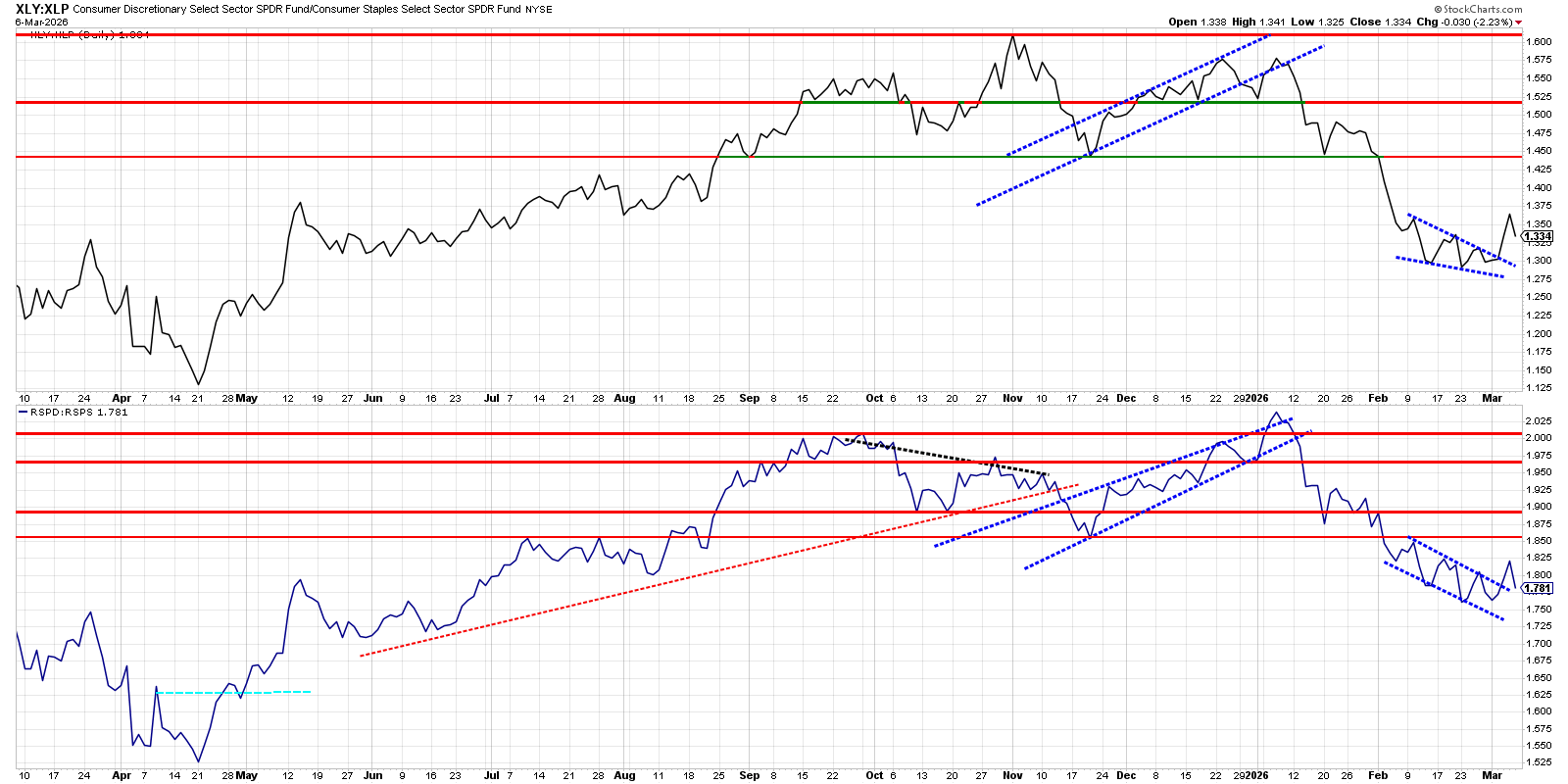 XLY is losing relative strength vs XLP, and RSPD is losing vs RSPS, with both pairs breaking prior RS uptrends and now sliding in bearish channels; current consolidations look like continuation flags to the downside.